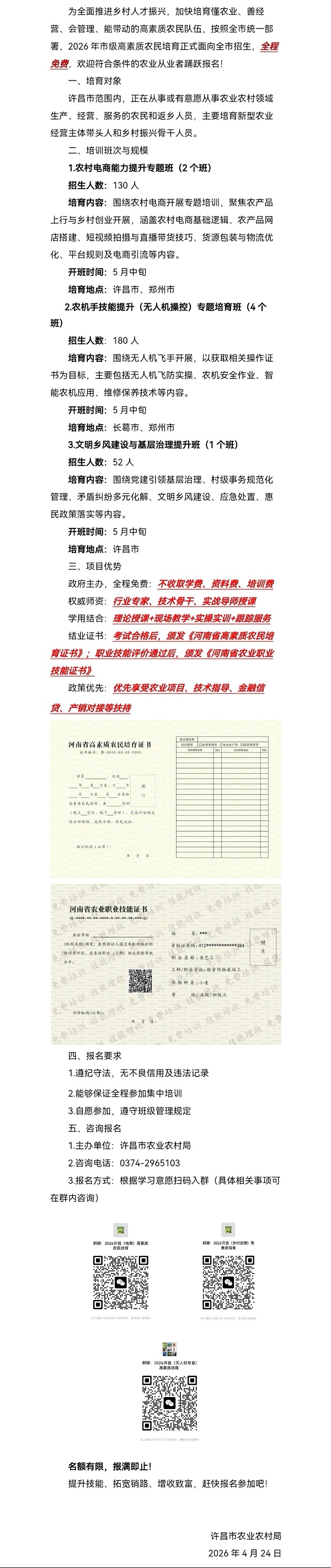 许昌市2026年高素质农民培育开始报名!全程免费,名额有限!